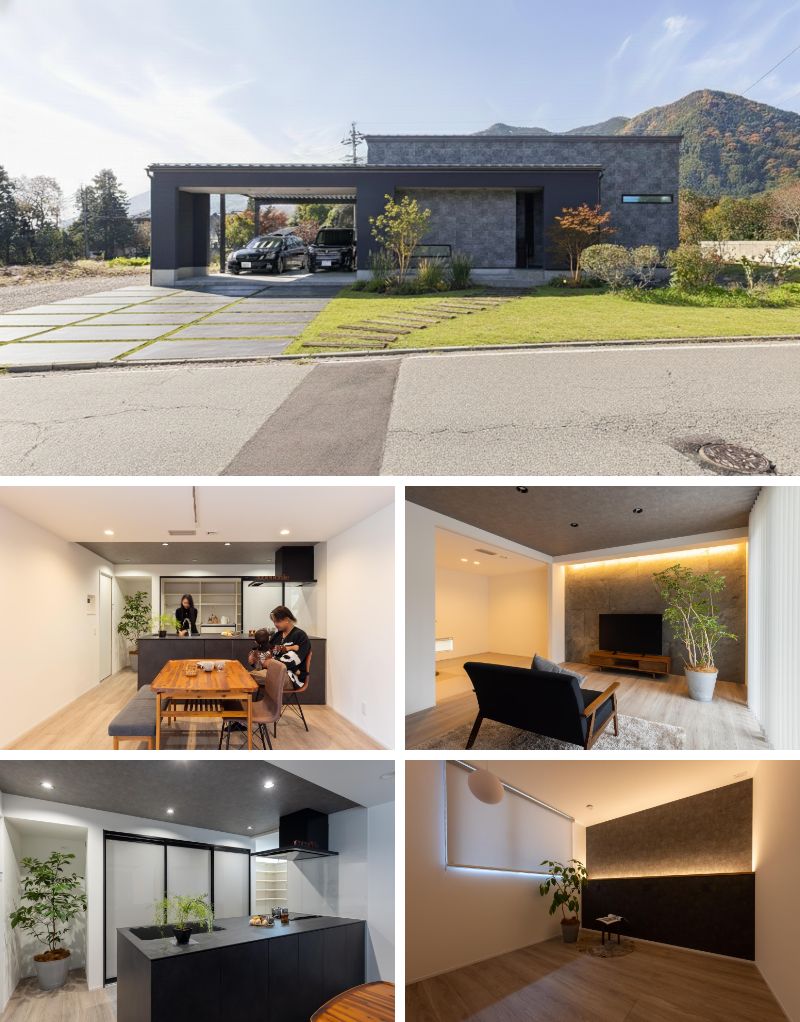 大判タイルとダークトーンの吹付でまとめた外観は、カーポートを建物と一体化させたシックで統一感ある佇まい。