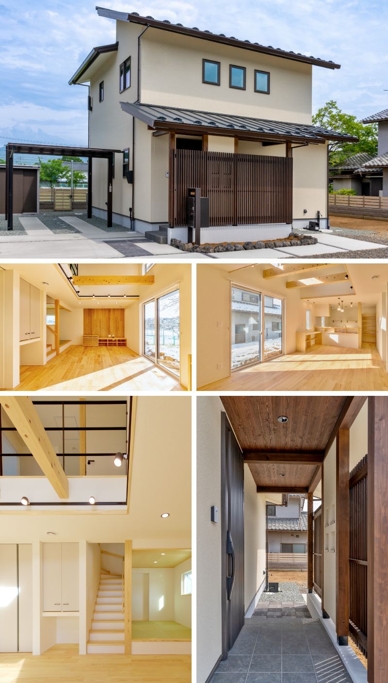 あずみ野赤松の無垢フロアーや県産桧構造梁の現しなど、ナチュラルなイメージの住まい。リビングにある大きな吹抜けは、階段室・2Fホールともつながることで自然とリビングに集う間取りとなり、床下エアコン搭載の全館空調システムによる室温ムラの少ない快適な居住空間となっています。